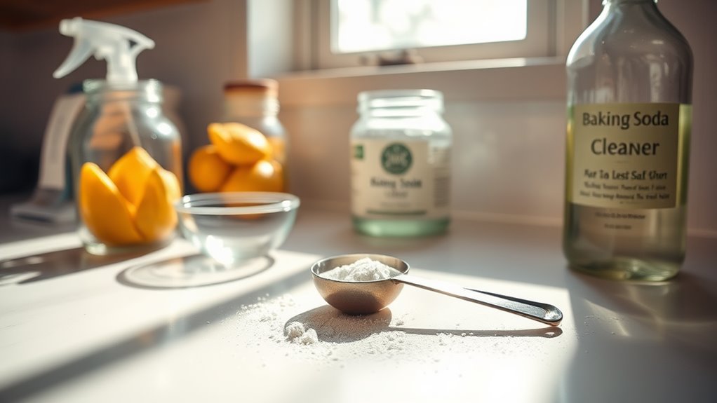 Baking soda’s generally safe for pets in small amounts, but it can cause stomach upset if ingested in larger quantities. Always consult your vet before using it around your furry friends to guarantee their safety.