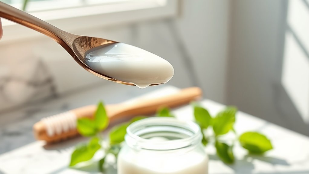 The prolonged swishing action mechanically dislodges plaque and microorganisms from tooth surfaces, interdental spaces, and gingival margins. Coconut oil’s medium-chain triglycerides, particularly lauric acid, demonstrate antimicrobial efficacy against Streptococcus mutans and other cariogenic pathogens. The saponification process occurs as the oil mixes with salivary enzymes, creating a cleansing effect that reduces bacterial adhesion. This practice, known as Gandusha or Kavala Graha in Sanskrit texts, has been used for over 3,000 years as a method to remove toxins and maintain oral health. You’ll achieve optimal results through consistent daily application, preferably performed on an empty stomach to maximize therapeutic benefits.
