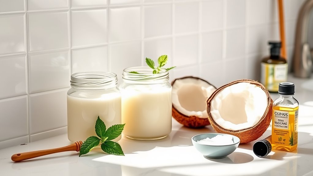 Coconut oil’s a must-have for your skin and hair! It acts as a versatile moisturizer for all skin types, locking in hydration without clogging pores. Use it as a natural hair conditioner to deeply hydrate and reduce frizz—apply warm oil from mid-length to ends. You can swap out your makeup remover for coconut oil too, effortlessly dissolving stubborn makeup while moisturizing your skin. If you’ve had too much sun, it works wonders for soothing sunburned skin. Don’t forget it excels as a lip balm and scrub for soft lips. You’ll uncover even more interesting uses ahead!