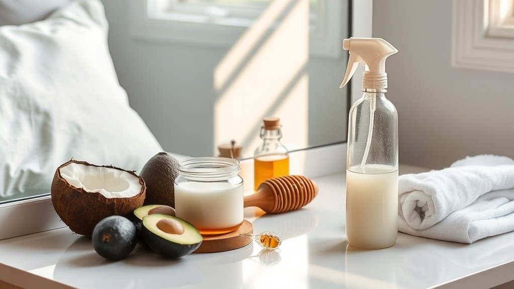 You’ll find honey’s humectant properties lock in moisture while coconut oil’s lauric acid penetrates the hair shaft to prevent protein loss.