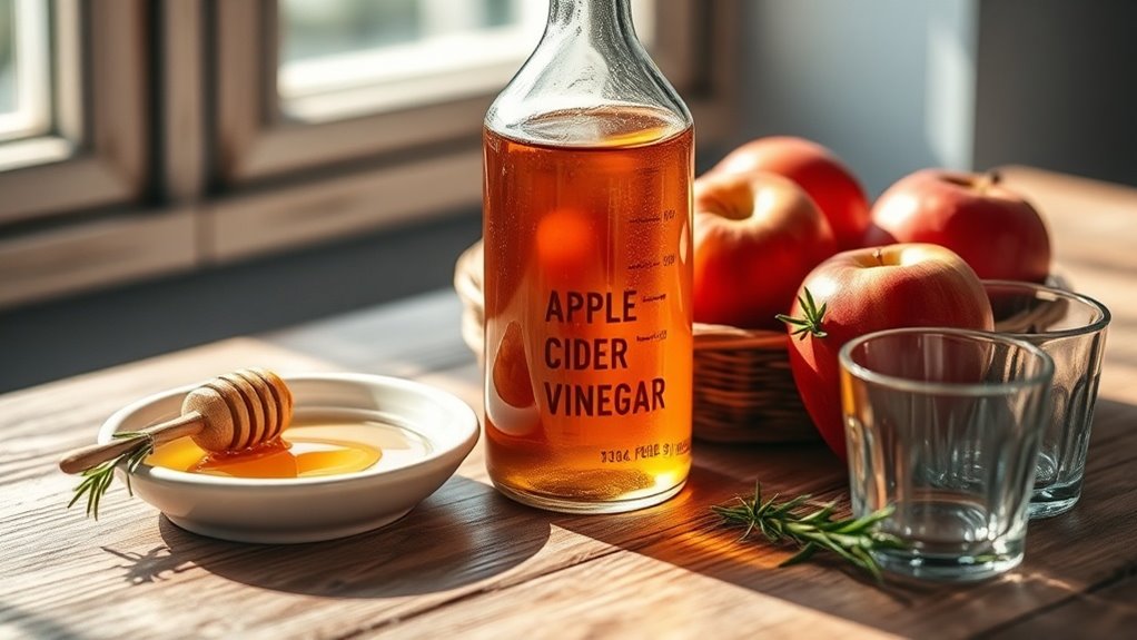 Before you can prepare a therapeutic apple cider vinegar beverage, you’ll need to assemble specific ingredients that guarantee both efficacy and palatability. Obtain raw, unfiltered apple cider vinegar containing the “mother”—a complex of beneficial acetobacter and polyphenolic compounds. You’ll require 1-2 tablespoons (15-30ml) per serving for ideal bioactive concentration.