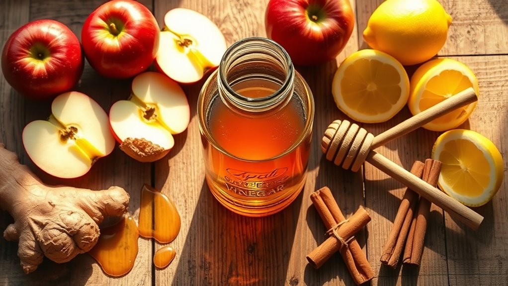 Beyond the foundational recipe, you’ll maximize therapeutic benefits by incorporating thermogenic and anti-inflammatory botanicals that synergize with acetic acid’s metabolic effects.