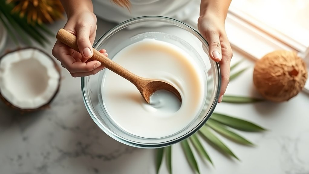 You can enhance efficacy by incorporating scalp massage techniques, stimulating blood flow and promoting follicular health. For severely damaged hair, overnight treatments yield superior reconstruction results when properly secured. When warming your coconut oil before application, the heat helps the medium-chain fatty acids penetrate more effectively into the hair shaft for deeper nourishment.