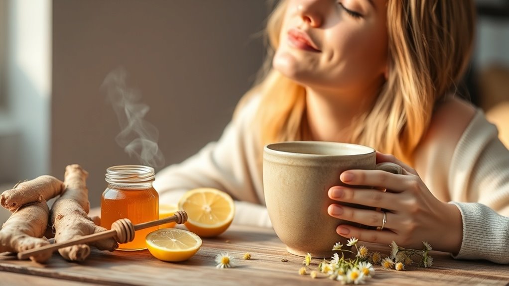 Unlike garlic’s aggressive antibacterial approach, chamomile tea works as a gentle anti-inflammatory that coats and calms your irritated throat tissues. You’ll find relief within minutes as its natural compounds reduce swelling and pain.