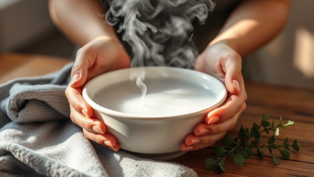 Steam inhalation delivers moisture directly to your airways, loosening mucus and calming the throat irritation that triggers dry coughs. For optimal results, inhale steam for 10-15 minutes per session, keeping your face 8-10 inches above the water to prevent burns. You’ll benefit most from repeating this 2-3 times daily, especially before bedtime and upon waking.