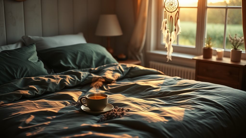 If you’re struggling to get a good night’s sleep, natural remedies can help you snooze in no time. Start with calming herbal teas like chamomile or lavender to ease tension. Incorporate essential oils in your bedroom with a diffuser or pillow spray to create a relaxing atmosphere. Enjoy sleep-inducing foods like bananas and cherries before bed to boost melatonin levels. Consider mindfulness techniques like deep breathing or guided meditation to quiet your mind. Finally, make sure your bedroom is dark and cool for ideal rest. Explore these strategies further to discover what works best for you!