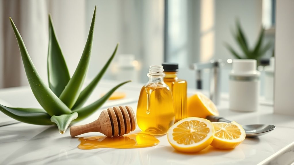 Raw honey’s antimicrobial properties target P. acnes bacteria while its osmotic effect draws out excess fluid. Apply green tea compresses to benefit from catechins’ anti-inflammatory action. Fresh lemon juice’s citric acid provides gentle exfoliation and pH balance, while raw apple cider vinegar’s alpha-hydroxy acids help unclog pores. Combine one tablespoon of baking soda with water to create an alkaline paste that neutralizes acid-loving bacteria and absorbs excess oil. Additionally, tea tree oil’s terpenes effectively eliminate P. acnes bacteria, enhancing the acne-fighting potential of your remedies.