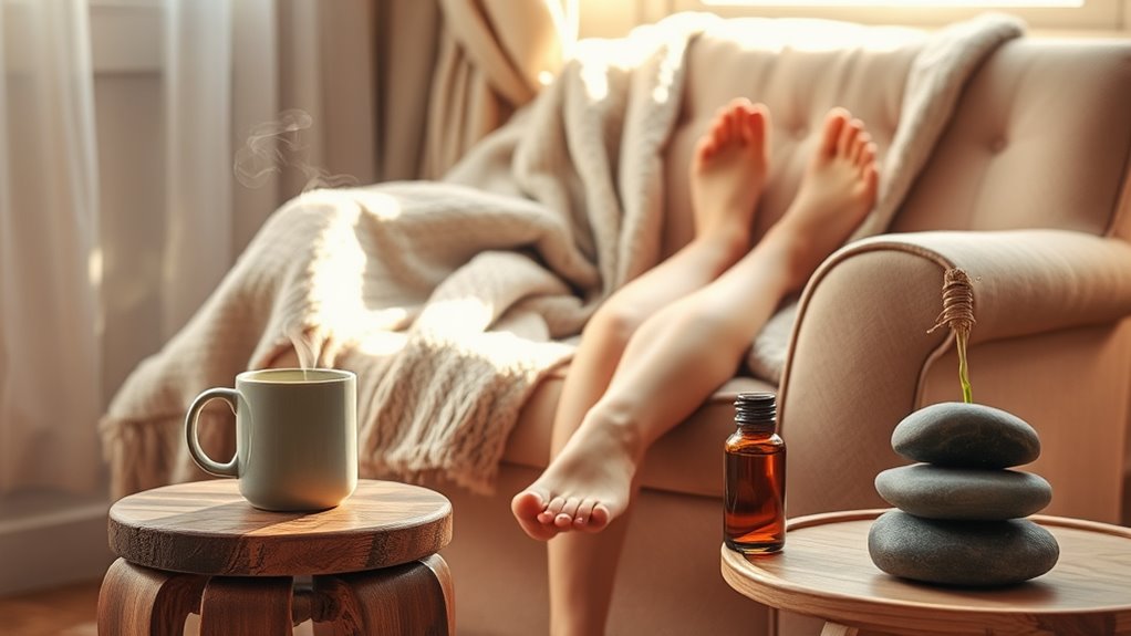 If you’re struggling with restless legs, try this soothing DIY remedy tonight. Mix a few drops of lavender and peppermint essential oils with a carrier oil like coconut or almond. Rub your palms together to warm the mixture, then gently massage it onto your legs, focusing on tense areas. The magnesium in Epsom salt can also help relax your muscles, so consider adding it to a warm bath before bed. Establish a regular sleep schedule and reduce caffeine intake for added relief. Want more tips on how to ease your restless legs? There’s plenty more to discover!