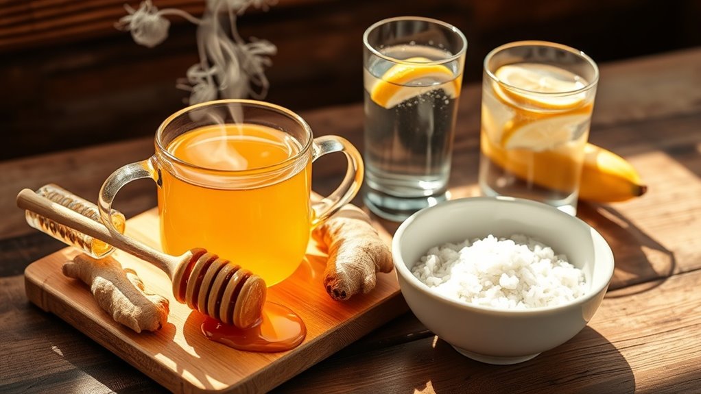 To recover faster from viral gastroenteritis, you’ll need to focus on aggressive hydration with electrolyte-rich fluids, consuming 2-4 liters daily in small sips. Start with the BRAT diet (bananas, rice, applesauce, toast) once you can tolerate food, and consider natural antiemetics like ginger tea. Get 7-9 hours of sleep to support immune function, and try probiotic supplements containing Lactobacillus strains to combat diarrhea. Understanding the complete treatment protocol can significantly accelerate your healing process.