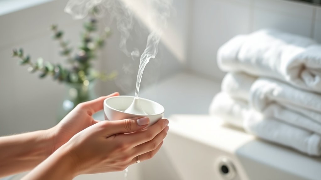 While warm drinks work internally to ease throat discomfort, steam inhalation targets your nasal passages and sinuses directly. You’ll need a bowl of hot water and essential oils like eucalyptus, peppermint, or tea tree. Add 3-5 drops to steaming water, drape a towel over your head, and breathe deeply for 5-10 minutes.
