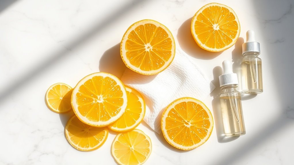 Lemon extracts contain citric acid and L-ascorbic acid (vitamin C) at concentrations that demonstrate measurable tyrosinase inhibition, with studies showing up to 40% reduction in melanin synthesis at 5% concentrations. You’ll find these compounds work through multiple mechanisms to address hyperpigmentation.