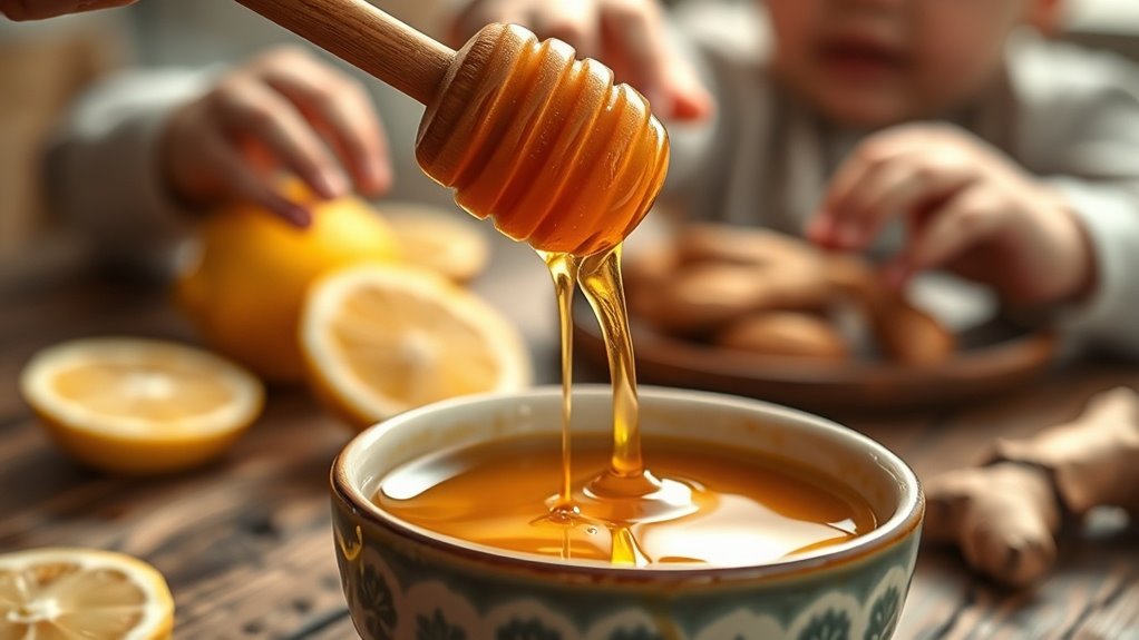 It coats the throat, providing instant relief while its antimicrobial properties support healing. You can offer it straight from the spoon or mix it into warm water or herbal tea. For an even more effective remedy, combine honey with fresh lemon juice and ginger to create a soothing throat mixture that kids actually enjoy taking. Remember, never give honey to infants under 12 months due to botulism risk. For older children, it’s an effective, sweet-tasting alternative to over-the-counter medications.
